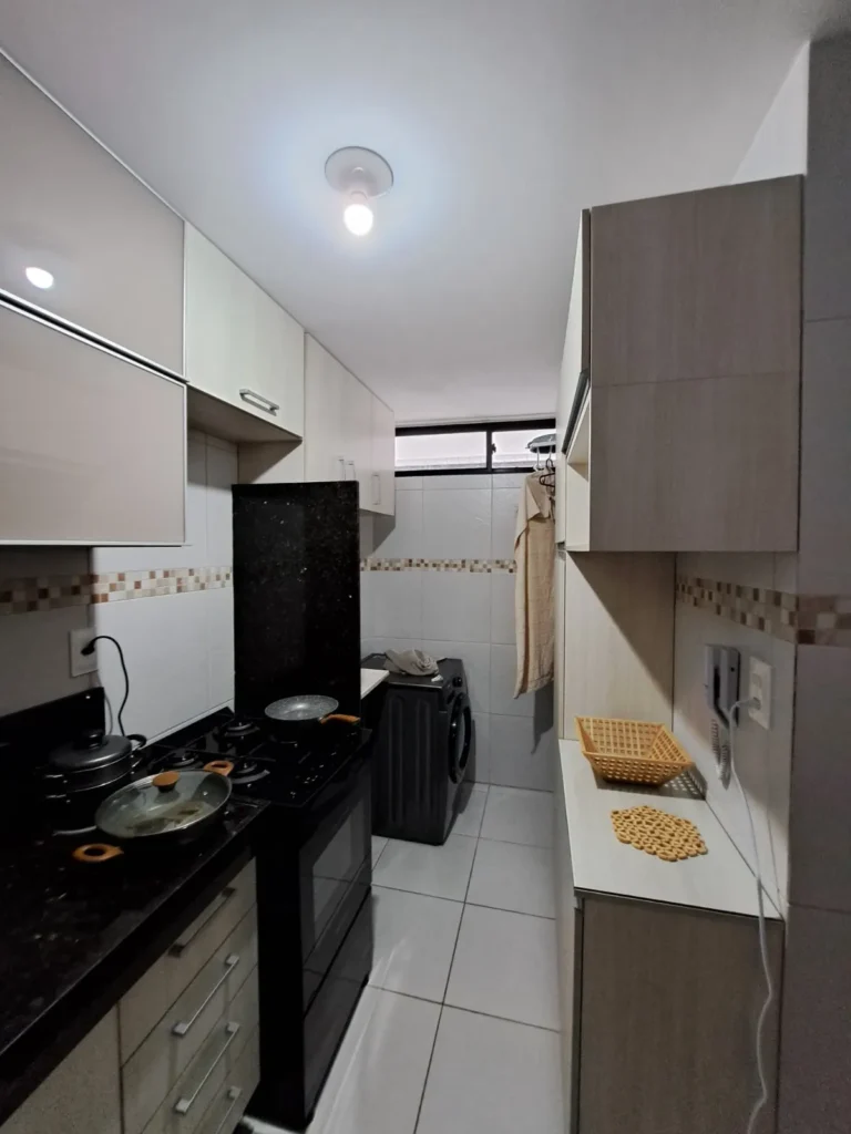 O apartamento conta com móveis projetados na cozinha e nos banheiros, proporcionando melhor aproveitamento de espaço e acabamento mais sofisticado.